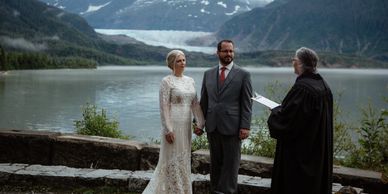 Simple ceremony, you bring your wedding license, a witness if you have one, or I can provide one for you . We can go out to the Mendenhall glacier, Skaters Cabin, or out to Auke Bay to the beach with beautiful mountains as your backdrop. I will provide the champagne, or sparkling cider, your silk flower bouquet and boutonniere, transportation for up to 7 adults, and I will file your official paperwork for you.